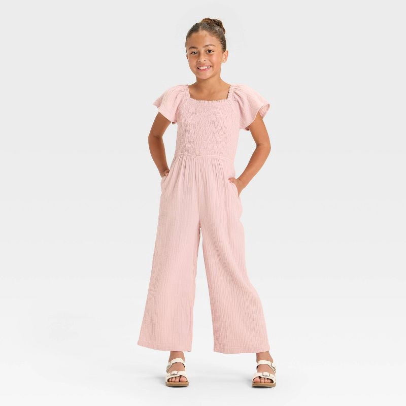 Infuse easy-breezy flair into your kid's casual closet with this Flutter Sleeve Smocked Jumpsuit from Cat & Jack™. Made from cotton gauze fabric with recycled polyester lining, this flutter-sleeve rom…