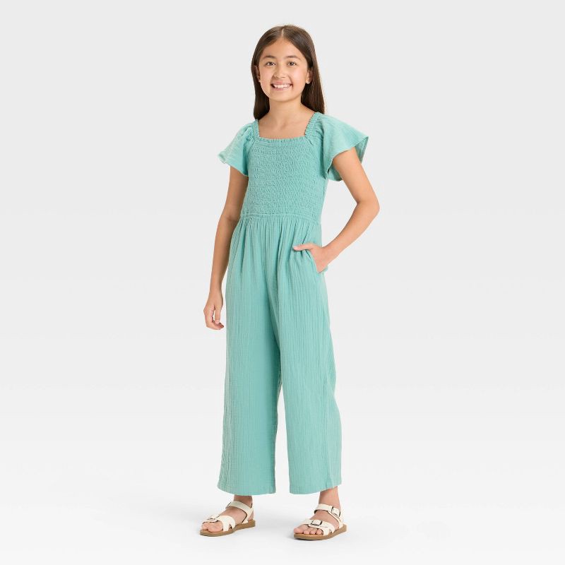 Infuse easy-breezy flair into your kid's casual closet with this Flutter Sleeve Smocked Jumpsuit from Cat & Jack™. Made from cotton gauze fabric with recycled polyester lining, this flutter-sleeve rom…