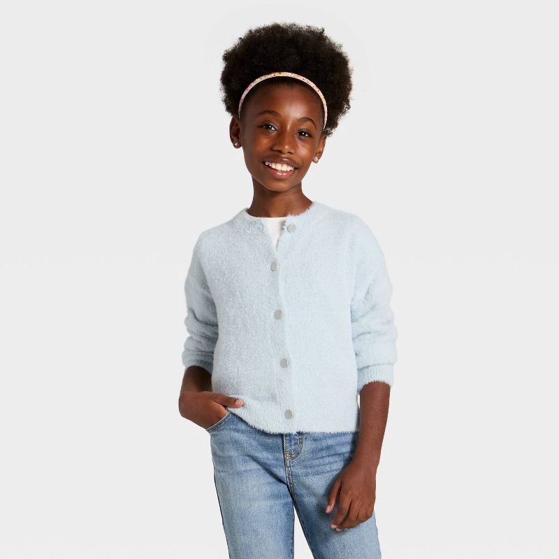 Add a touch of cozy charm to their wardrobe with this Fuzzy Cardigan from Cat & Jack™. Made from a fabric blend of nylon, recycled polyester, viscose, recycled nylon, and metallic fibers, this cardiga…