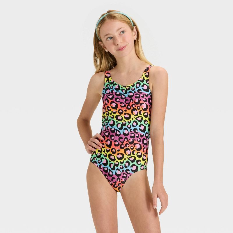 Add roaring style to your kid's swim closet with the Rainbow Cheetah Printed One-Piece Swimsuit from Cat & Jack™. This swimsuit features a sleeveless design with a rainbow-hued cheetah print for a fan…