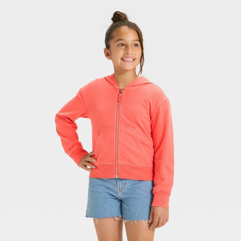 Hooded zipper sweatshirt in a solid hue for comfortable wear on active days. Made from cotton-recycled polyester blend French terry fabric for cozy comfort. Features side pockets for stashing small ev…