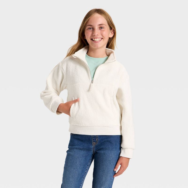 slide 1 of 3, Girls' Reverse Fleece Quarter Zip Pullover Sweatshirt - Cat & Jack™ Cream XL, 1 ct