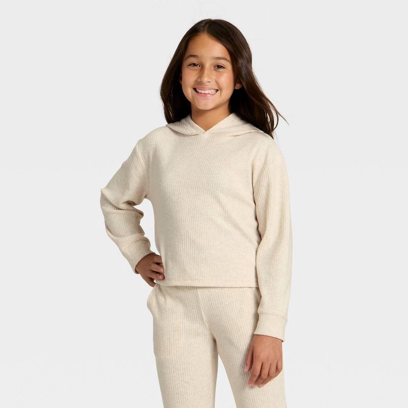 Girls' Cozy Ribbed Hooded Pullover Sweatshirt - Cat & Jack™ Oatmeal L