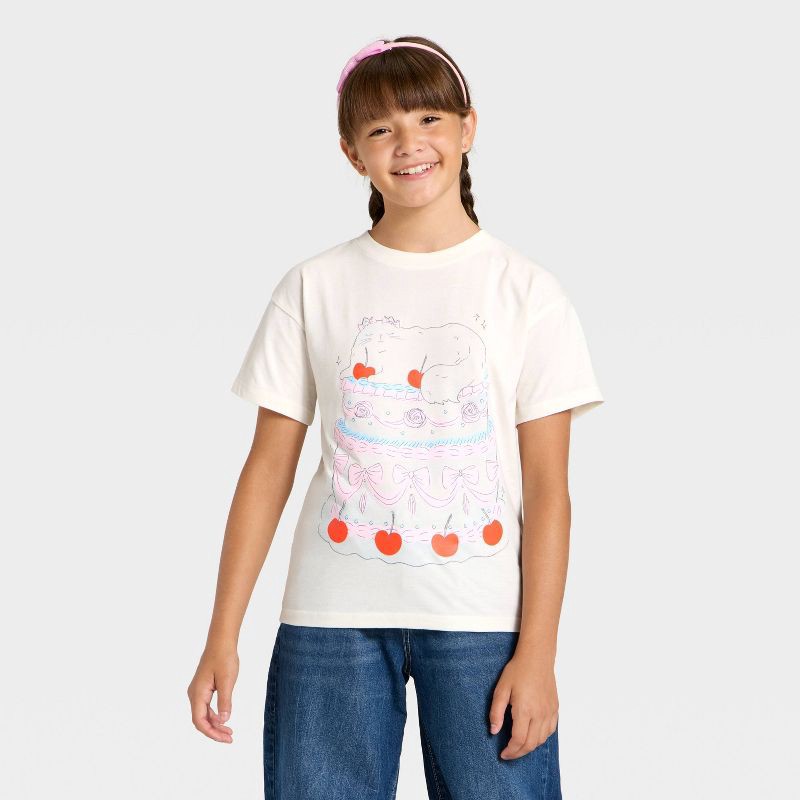 Add sweet, whimsical style to their closet with the Short-Sleeve Oversized 'Cat Cake' Graphic T-Shirt from Cat & Jack™. This off-white T-shirt features graphics of a cat sitting atop a cake for a swee…