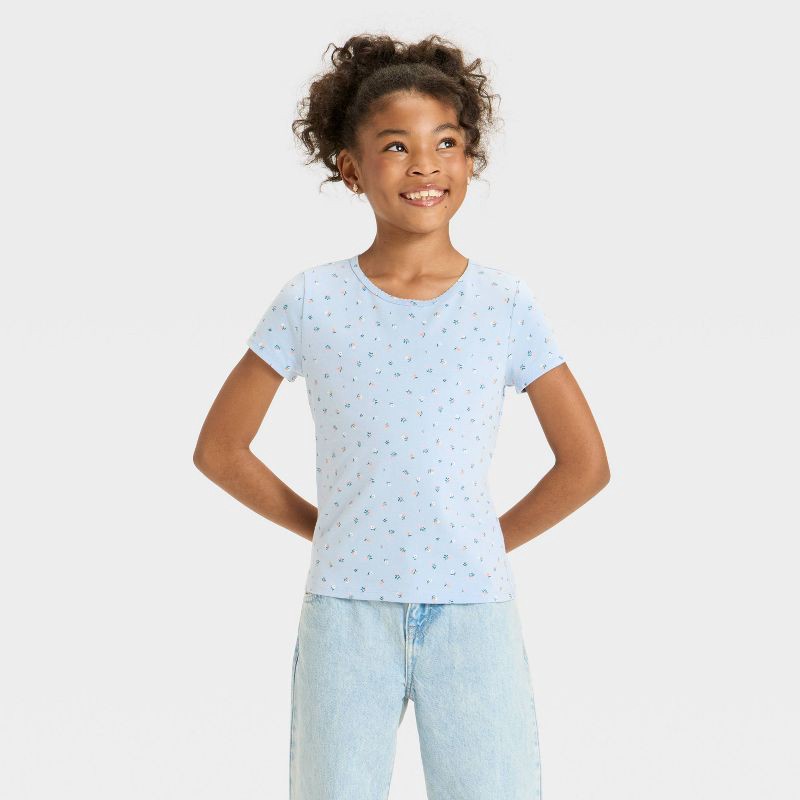 Girls' Short Sleeve Fitted Floral T-Shirt - Cat & Jack™ Light Blue L