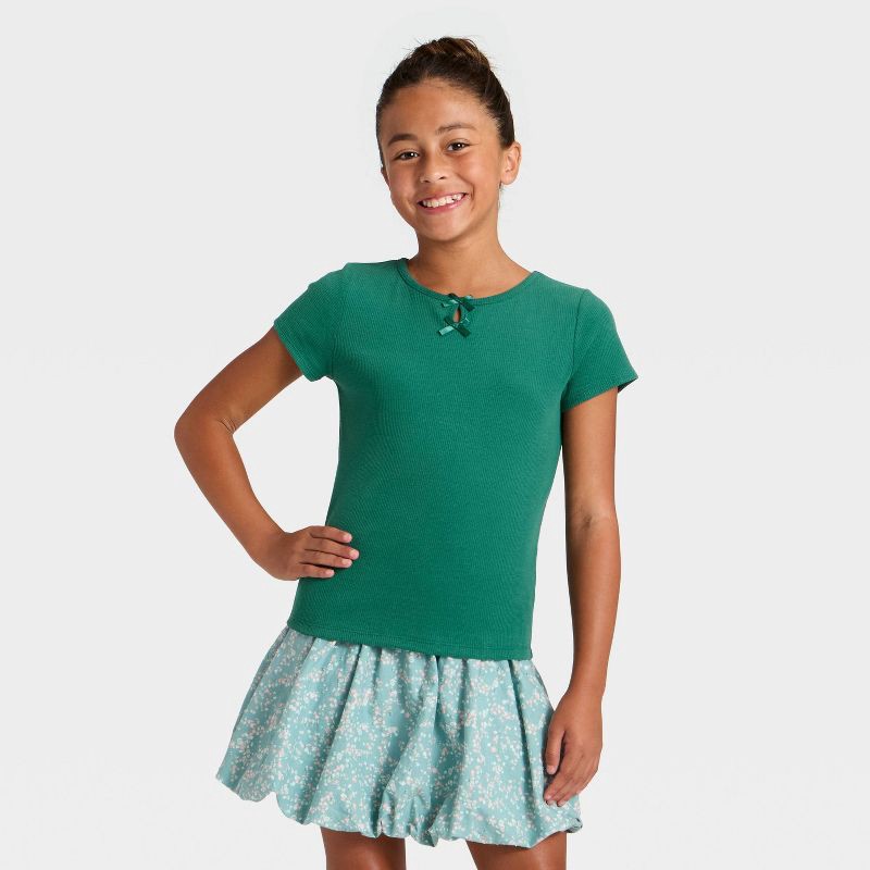 Girls' Short Sleeve Ribbed Bow Front T-Shirt - Cat & Jack™ Dark Green L