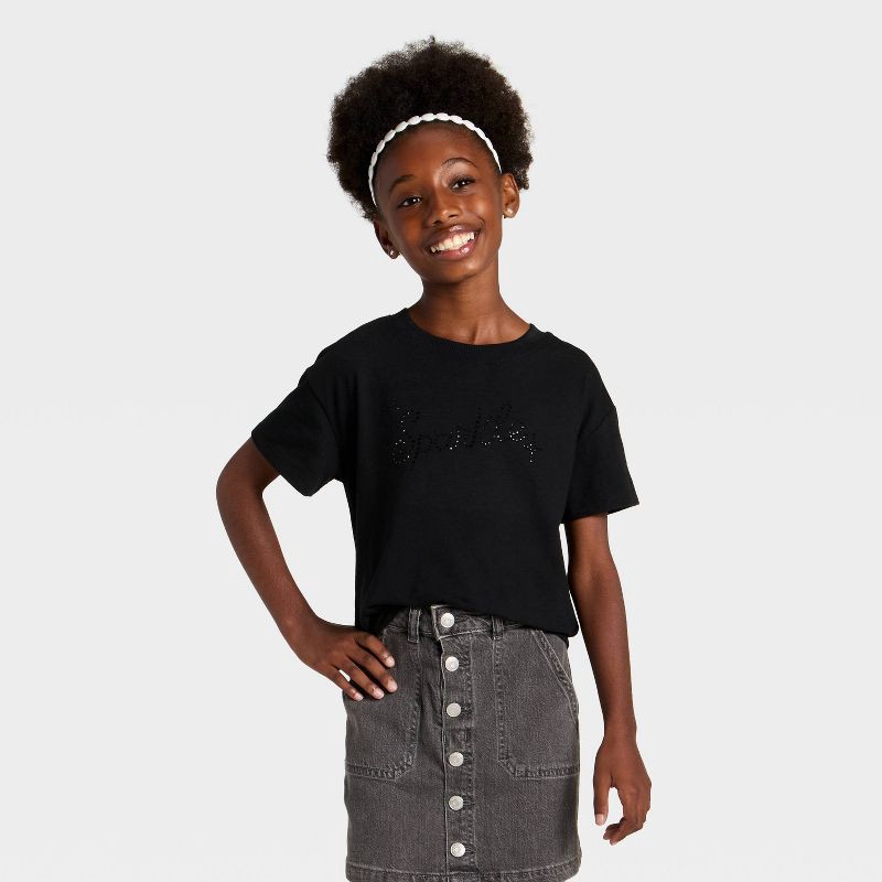 slide 1 of 4, Girls' Short Sleeve Sparkle Relaxed Fit Graphic T-Shirt - Cat & Jack™ Black L, 1 ct