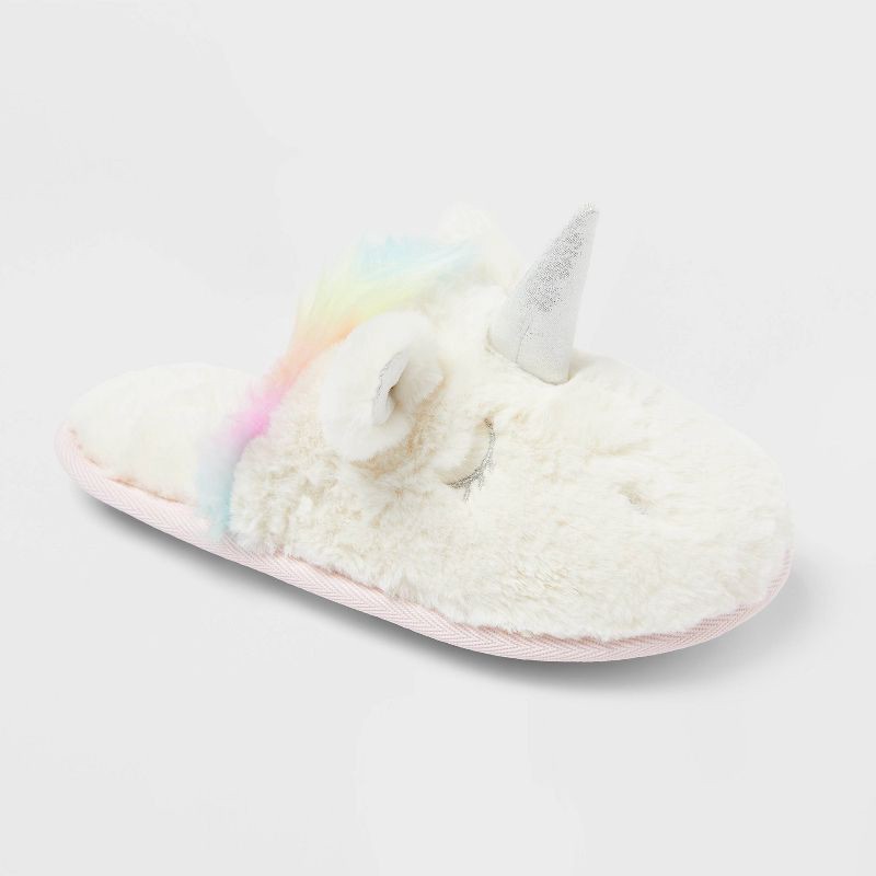 Add a touch of magic and plenty of comfort to your child's feet with these Unicorn Scuff Slippers from Cat & Jack™. These ivory-color scuff slippers feature a faux-fur closed-toe upper and matching cu…