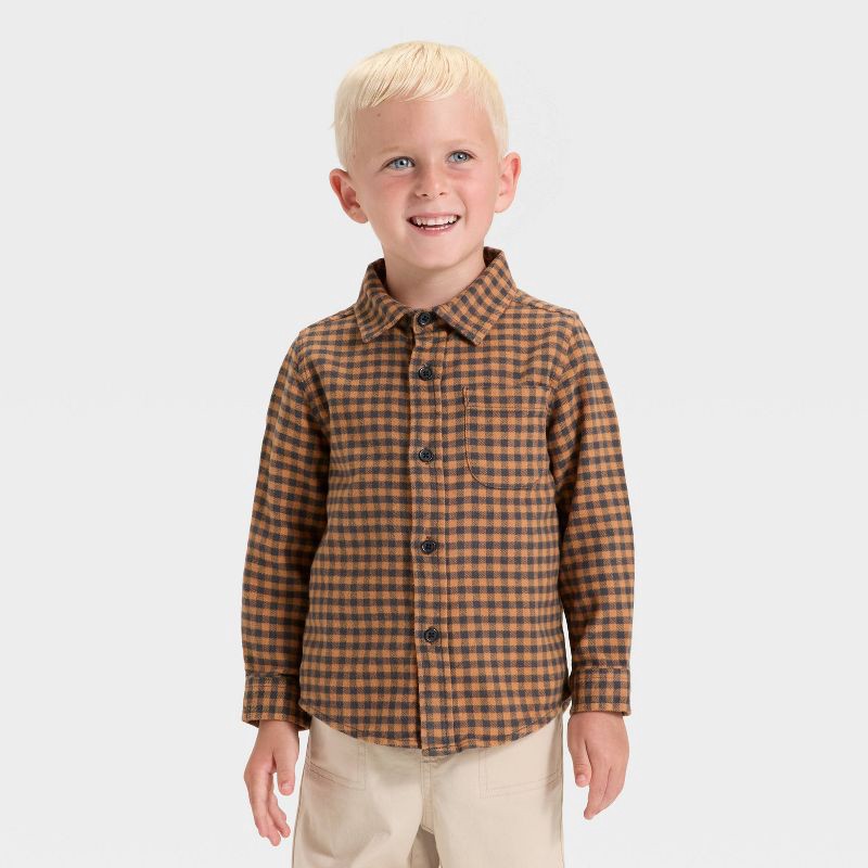 Get your little one ready for dressed-up occasions in this Buffalo Check Woven Long-Sleeve Button-Down Shirt from Cat & Jack™. Boasting a midweight flannel construction from a cotton-recycled cotton b…