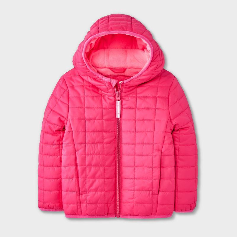 Your toddler will be ready for fun outdoor adventures in this Value Hooded Puffer Jacket from Cat & Jack™. Tailored in a casual fit, this hooded puffer jacket in dark pink is made from recycled polyes…