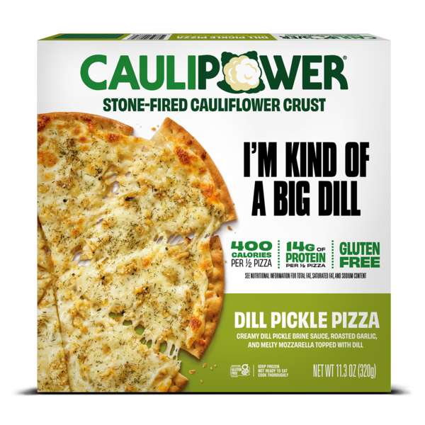 Creamy dill pickle brine sauce, roasted garlic, and melty mozzarella, topped with dill, on thin & crispy cauliflower pizza crust. 400 calories per 1/2 pizza. 14 g protein per 1/2 pizza. Certified glut…