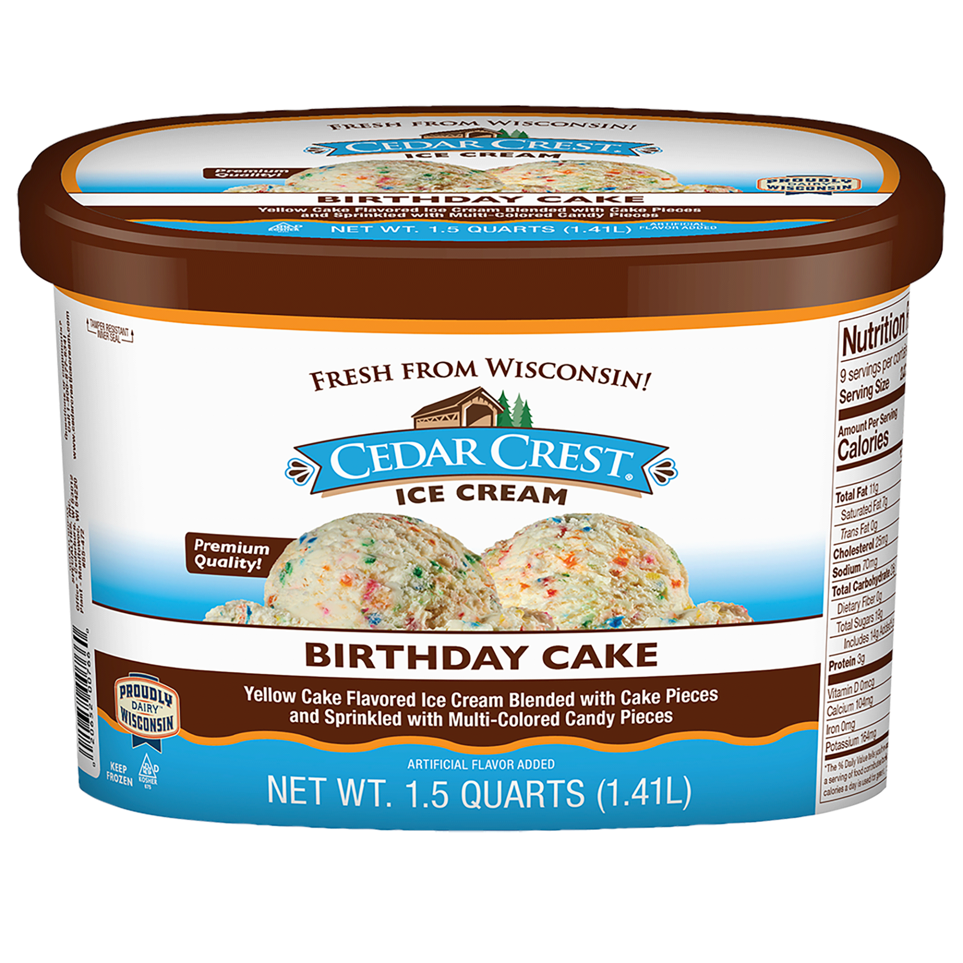 You will love this delicious yellow cake flavored ice cream that is blended with cake pieces and sprinkled with multi-colored candy pieces! It is premium quality fresh from Wisconsin!