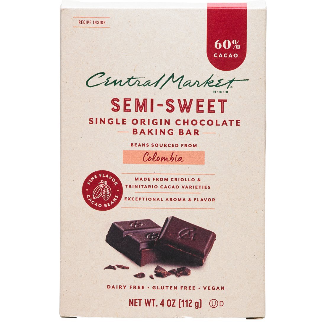 For exceptional chocolate flavor and aroma, opt for a Central Market baking bar. Crafted from 60% cacao beans that are responsibly sourced from family farms in Colombia, this semi-sweet chocolate is p…