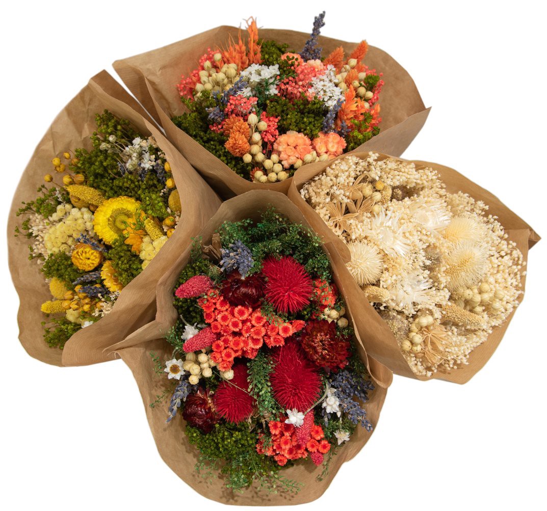 These beautiful bouquets are dried and last practically forever. To maintain the brightness, keep out of direct sunlight and store in a dry environment. *Note, color options are not guaranteed and areā¦