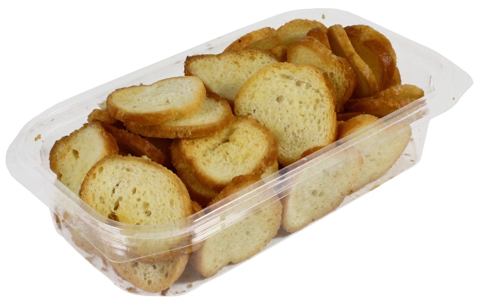 We take French bread, toss it in a blend of olive oil, butter, granulated garlic, and shredded parmesan, then bake until crispy for delicious croutons any salad would be lucky to have.