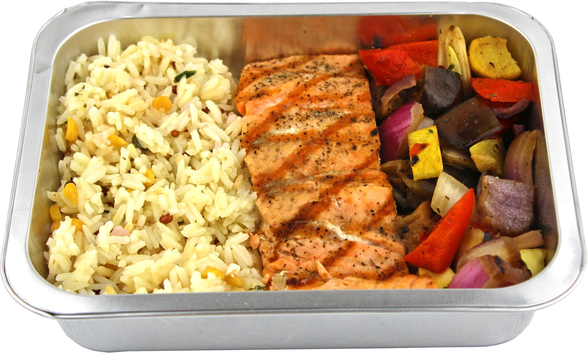 Central Market Chef Prepared Grilled Salmon Dinner for One. Grilled salmon, lemon scented jasmine rice blend and antipasto grilled vegetables.