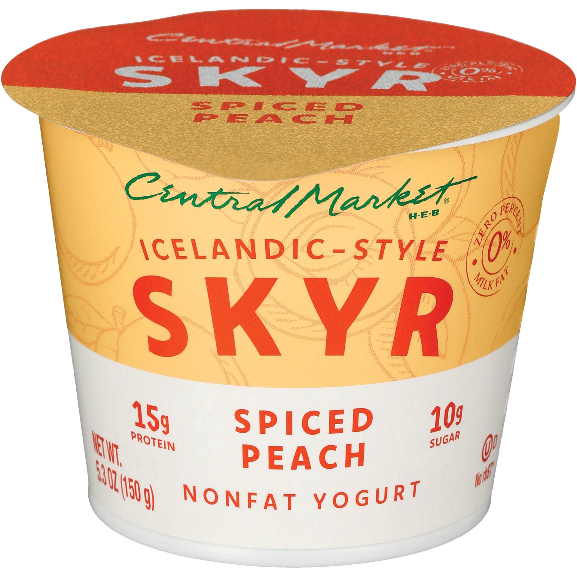 Deliciously thick and creamy, Central Market by H-E-B Icelandic-style Skyr Spiced Peach nonfat yogurt is thoughtfully crafted to be rich in protein, not in sugar. The ingredients? Plain and simple. Th…