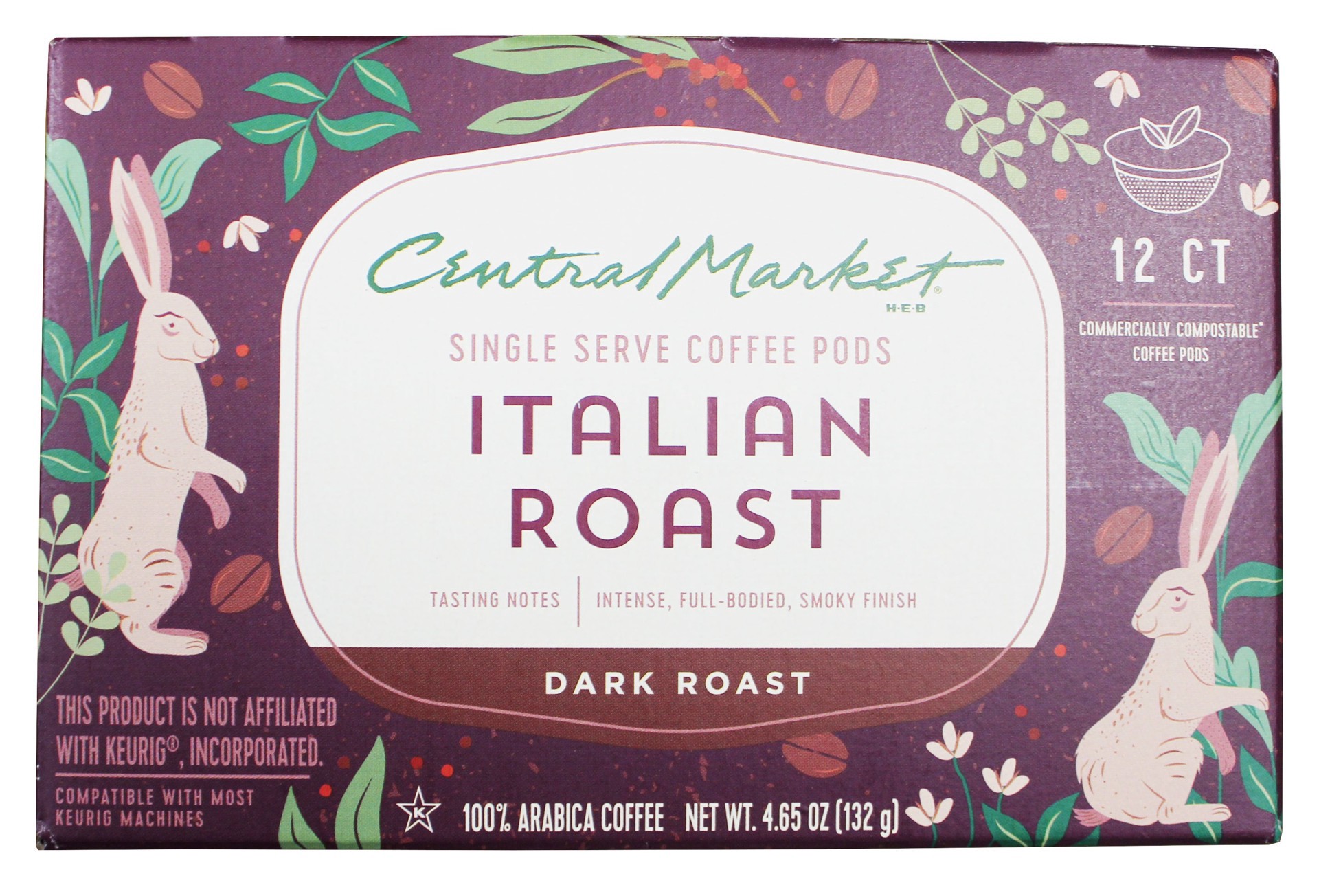 Experience the boldest cup we've ever crafted with our Central Market Italian Roast Single-Serve Coffee Pods. This intensely dark roast draws out rich oils from the beans, delivering a deep, full-bodi…