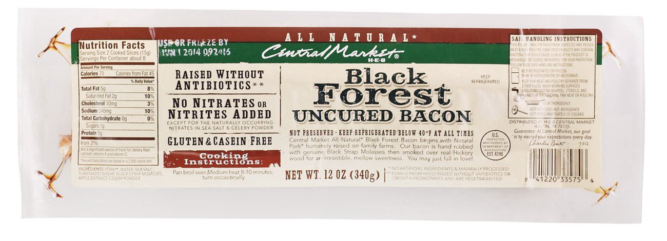 Central Market all natural* black forest bacon begins with exceptional quality natural pork* humanely raised on family farms. Our bacon is hand rubbed with genuine black strap molasses then smoked oveā¦