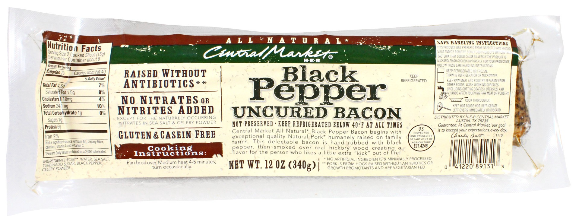 Central Market All Natural* Black Pepper Bacon begins with exceptional quality natural* pork humanely raised on family farms. This delectable bacon is hand rubbed with black pepper, then smoked over r…