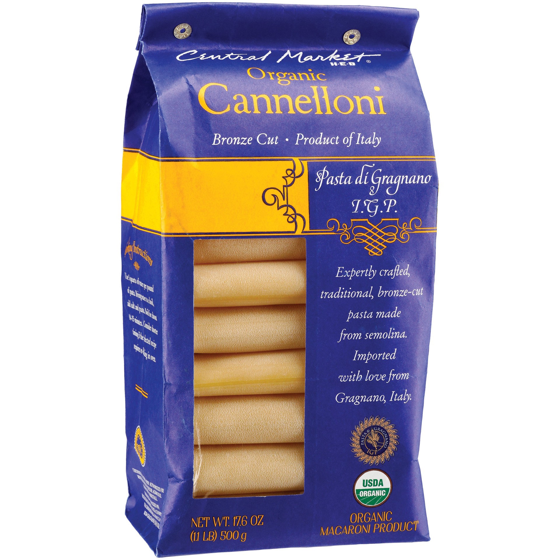Central Market Organic Cannelloni Bronze Cut Pasta. Expertly crafted, traditional, bronze-cut pasta made from semolina. Imported with love from Gragnano, Italy.
