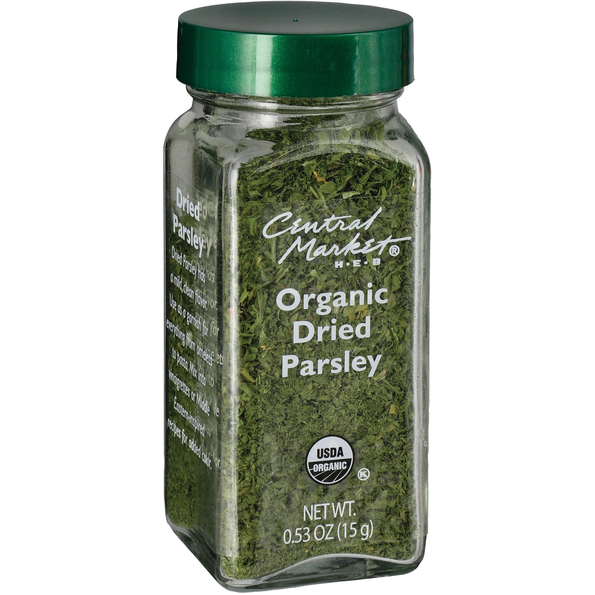 Our Central Market Organics Dried Parsley has a mild, clean flavor. Use as a garnish for everything from omelets to pasta. Mix into vinaigrettes or Middle Eastern-inspired recipes for added color.