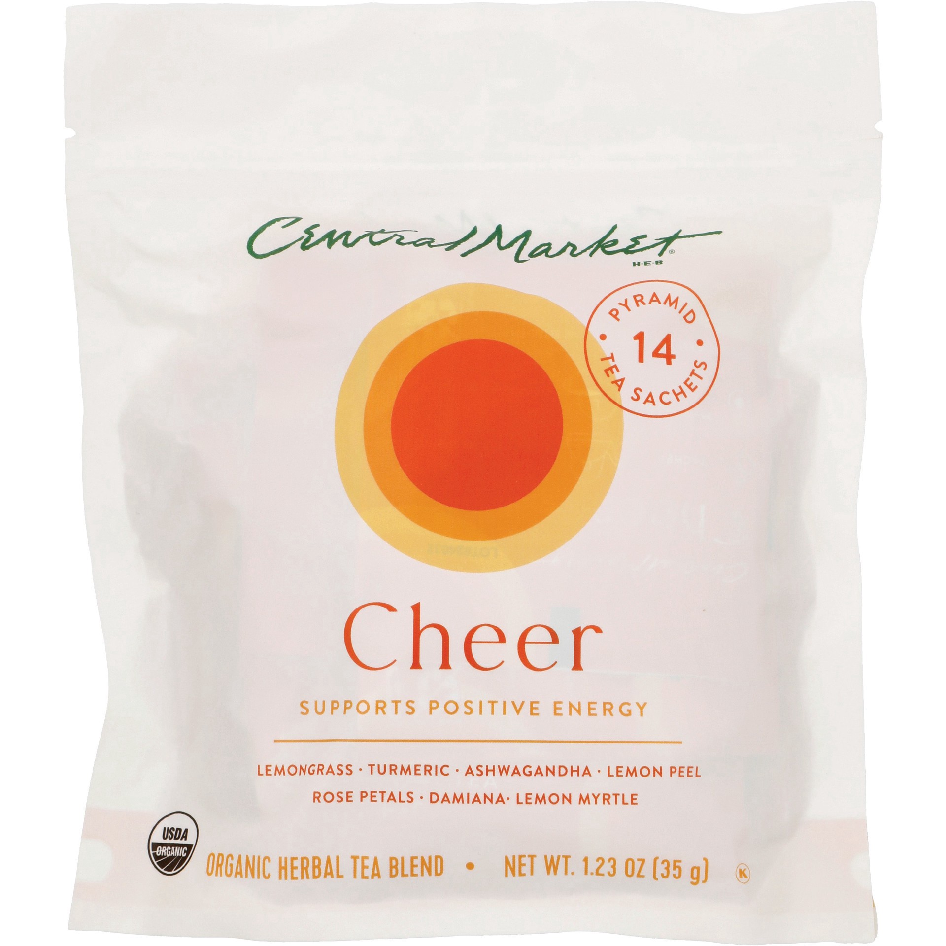 With a golden burst of tartness and a touch of mellow sweetness, Central Market Organic Herbal Tea Blend, Cheer, is sure to brighten your spirits. These pyramid tea sachets are made from plant-based p…
