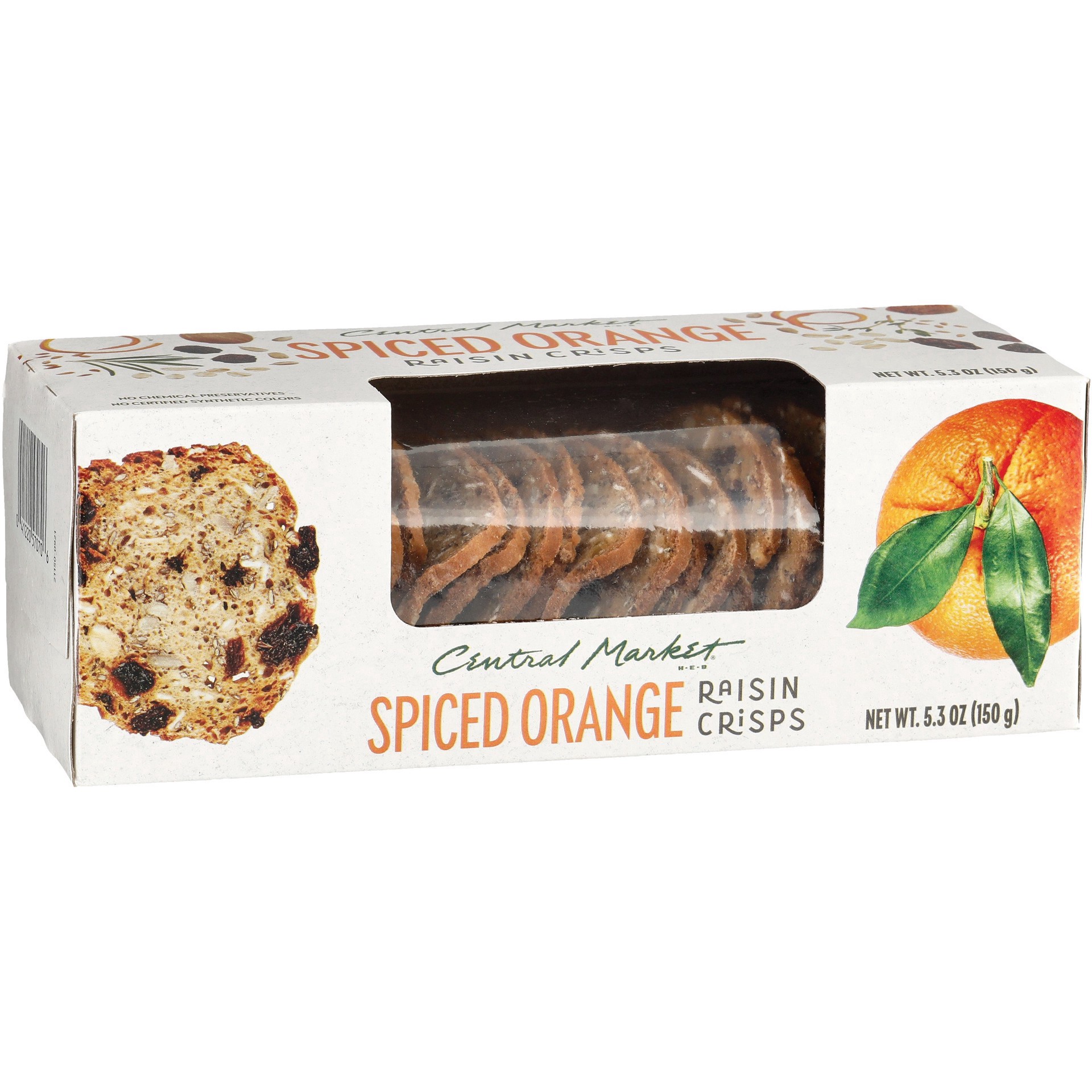 Perfect for snacking or entertaining, Central Market Spiced Orange Raisin Crisps go well with all kinds of toppers and dips. Even better, they're made with no artificial flavors, certified synthetic c…