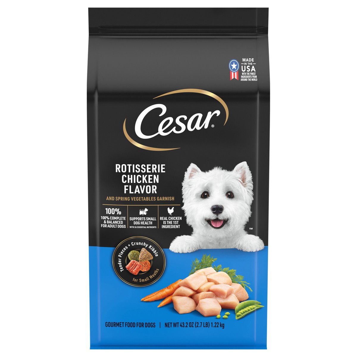 Calorie Content (Calculated): 3466 kcal ME/kg\, 344kcal ME/Cup. Cesar Rotisserie Chicken Flavor and Spring Vegetables Garnish is formulated to meet the nutritional levels established by the AAFCO Dog …