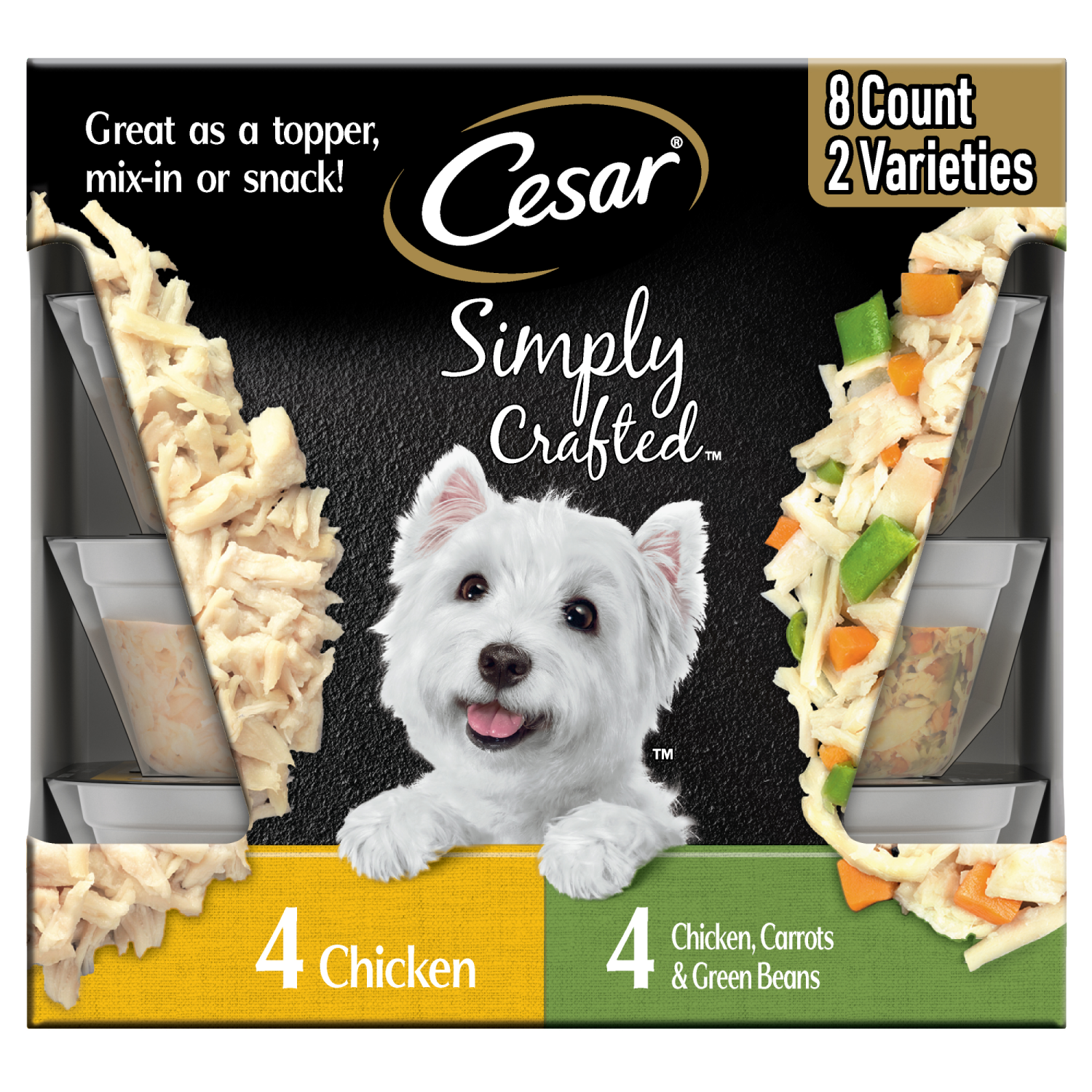 Simply Crafted Chicken: Chicken, Water. Simply Crafted Chicken, Sweet Potato, Apple, Barley & Spinach: Chicken, Carrots & Green Beans.