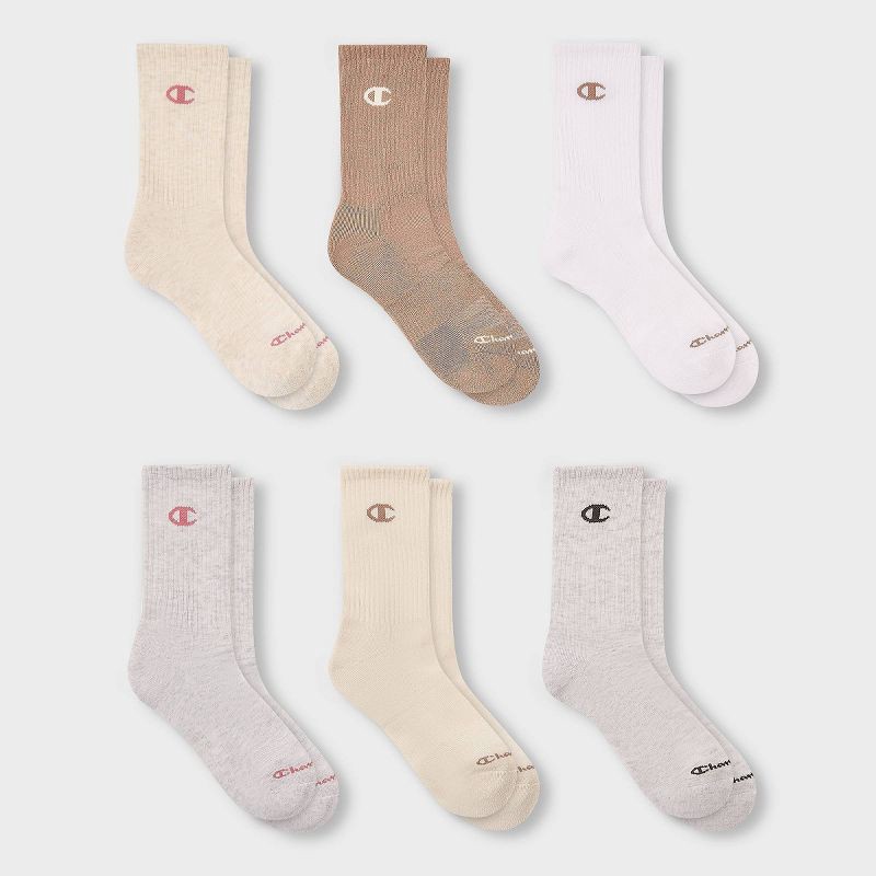 Champion Iconic Essentials Women's 6pk Cushioned Crew Socks - Oatmeal/Tan/White/Gray 4-10