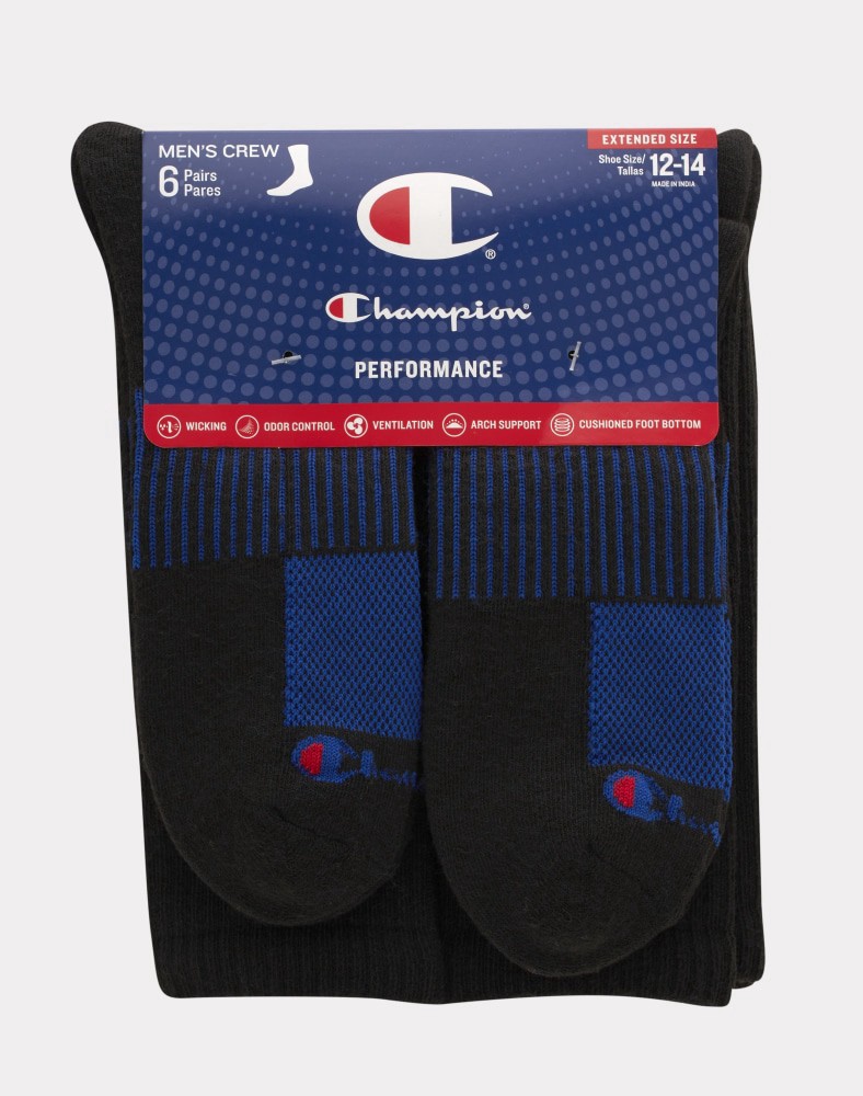 Champion® Mens High Performance socks have 6 pair in a pack. Features:Ventilation panels - breathabilityArch CompressionFresh IQ - odor controlX-Temp technology (start cool/stay cool)
