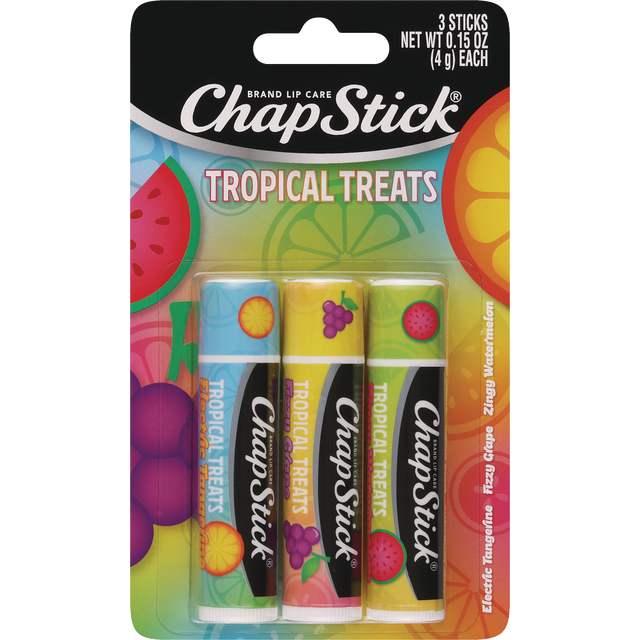 Escape to the tropics with ChapStick Tropical Treats Flavored Lip Balm! With bold juicy flavors like Zingy Watermelon, Electric Tangerine, and Fizzy Grape, you can bring the island vibes straight to y…