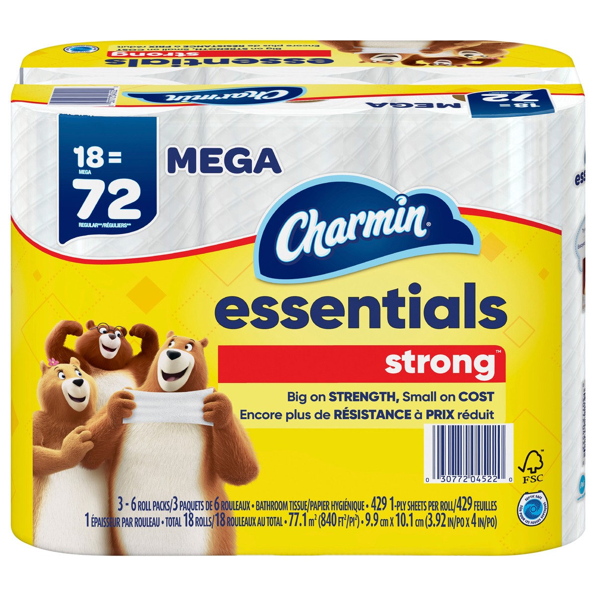 18 mega = 72 regular (based on number of sheets in Charmin regular roll). Big on strength, small on cost. Septic safe. Charmin is safe for your sewer of septic system. FSC. Rainforest Alliance certifiā¦