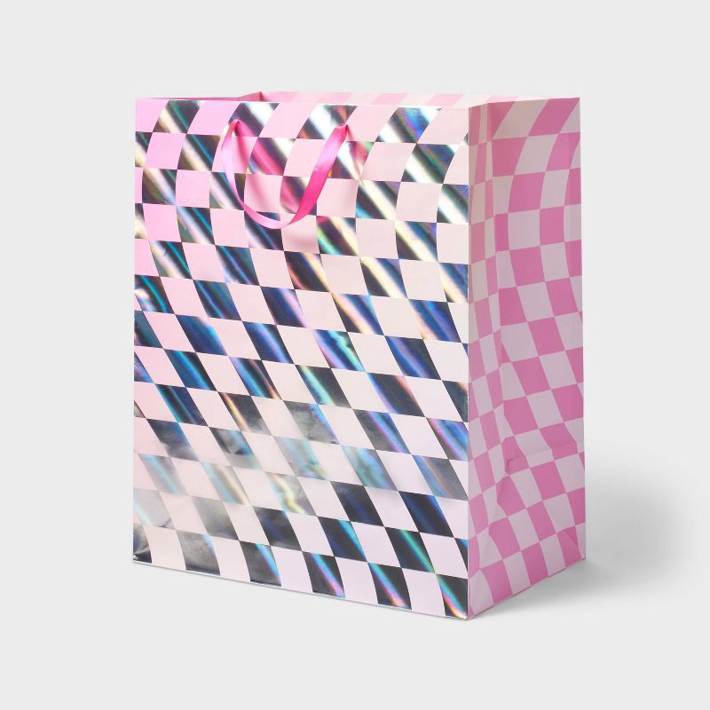 Make your gifts delightful inside-out with the Jumbo Teen Girl Checkered Gift Bag - Spritz™. With a wavy checkered pattern in a pink and iridescent finish, this jumbo paper bag is a trendy way to pres…