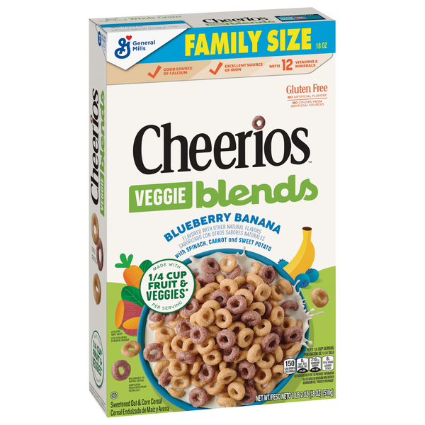 Cheerios Veggie Blends is an O-so-yummy cereal for the family made with fruits and vegetables. A wholesome bowl of Blueberry Banana flavored Cheerios Blends Cereal contains 1/4 cup of fruit and veggie…