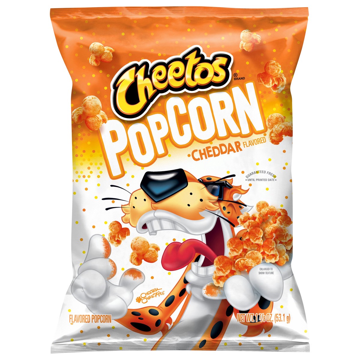Chester Cheetah. When popcorn meets Cheetos, it's a Cheetos thing. Guaranteed fresh until printed date. fritolay.com. SmartLabel: Scan for more food information or call 1-800-352-4477. Questions or co…