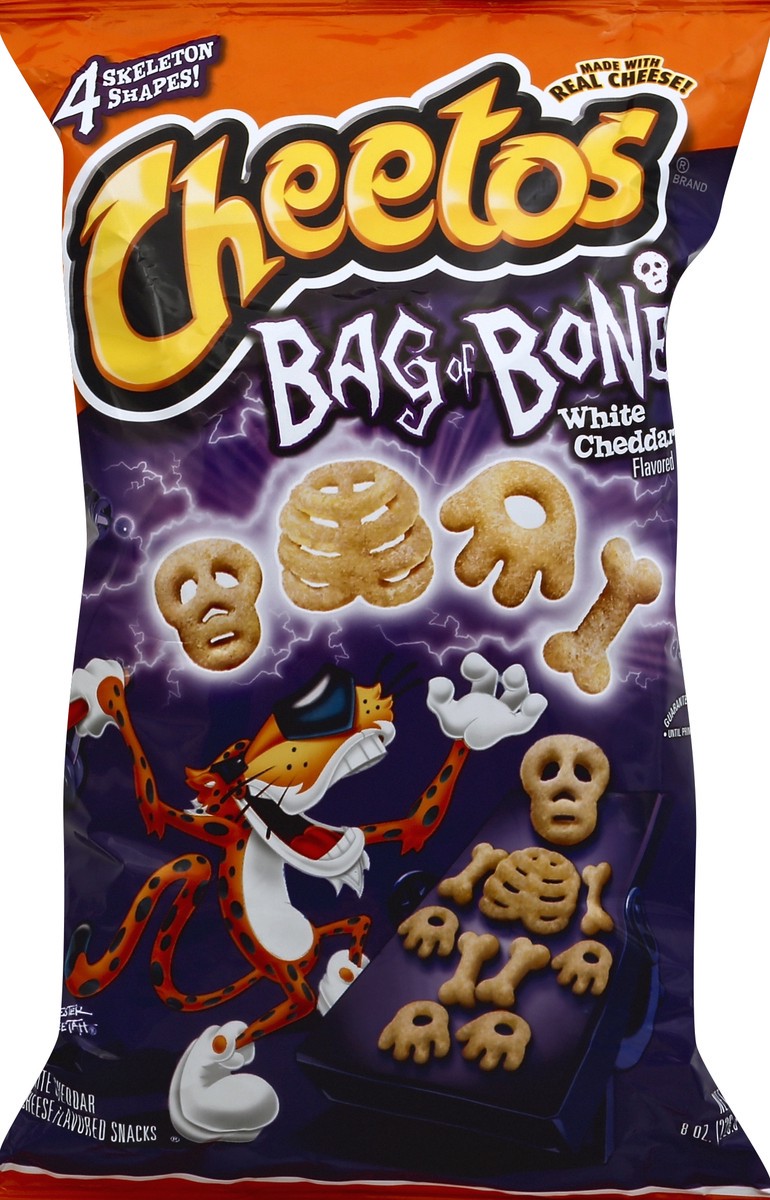 4 skeleton shapes! Made with real cheese! Guaranteed fresh until printed date. Chester Cheetah. Questions or comments? 1-800-352-4477 Mon-Fri 9:00am to 4:30 pm CT/email or chat at fritolay.com. Guaran…