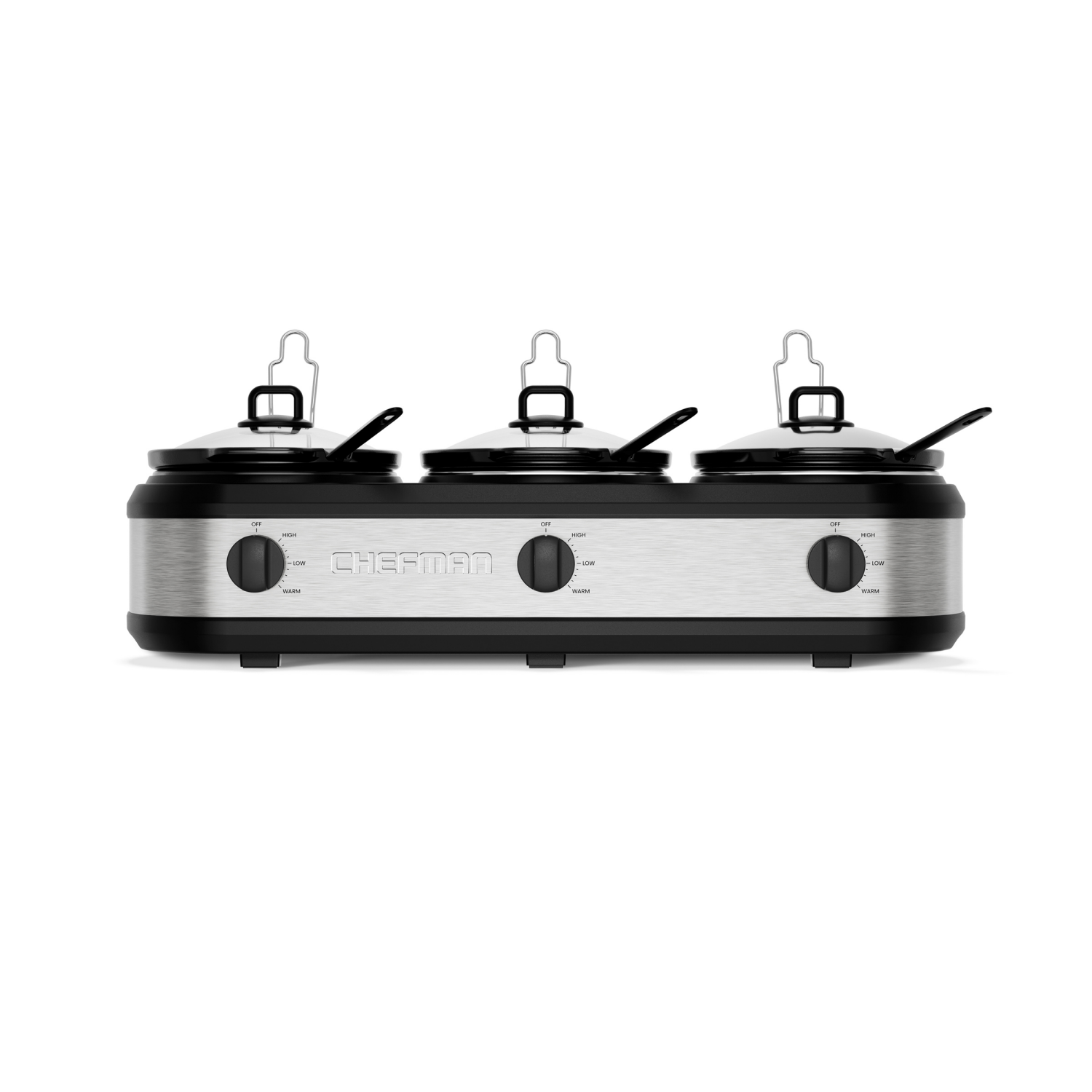 Enjoy triple the cooking and triple the possibilities with the Chefman Triple Slow Cooker and Buffet Server! With three 2.5-quart inserts, you can use one, two, or all three at the same time for famil…
