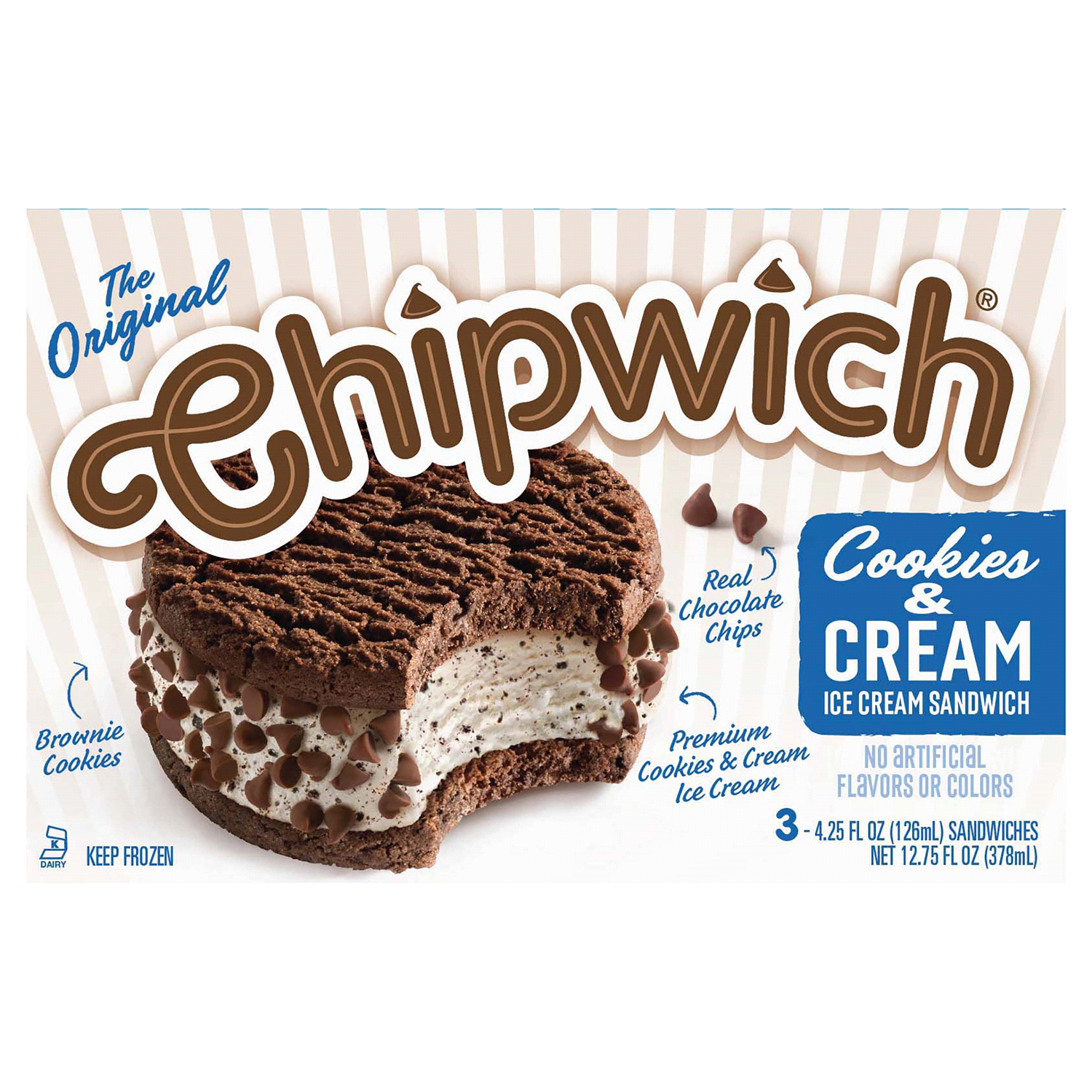 Real Chocolate Chips. Premium Cookies& Cream Ice Cream. Brownie Cookies. No artificial flavors or colors. The original. Browne cookies. Real chocolate chips. Premium cookies & cream ice cream. The one…