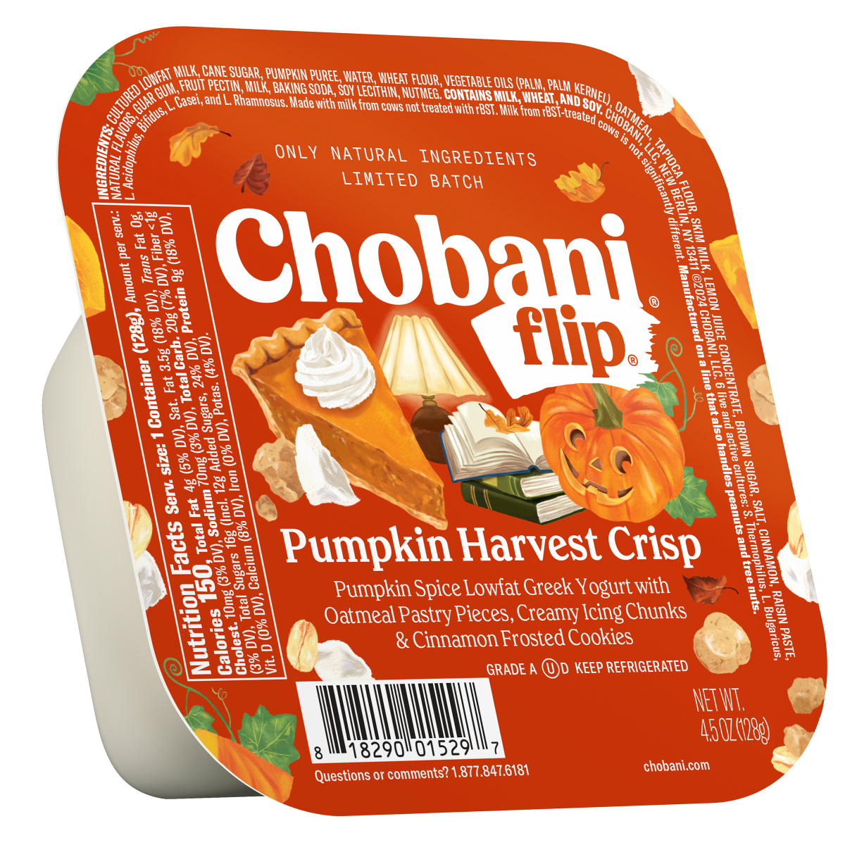 Cultured Lowfat Milk, Cane Sugar, Pumpkin Puree, Water, Wheat Flour, Vegetable Oils (Palm, Palm Kernel), Oatmeal, Tapioca Flour, Skim Milk, Lemon Juice Concentrate, Brown Sugar, Salt, Cinnamon, Raisin…