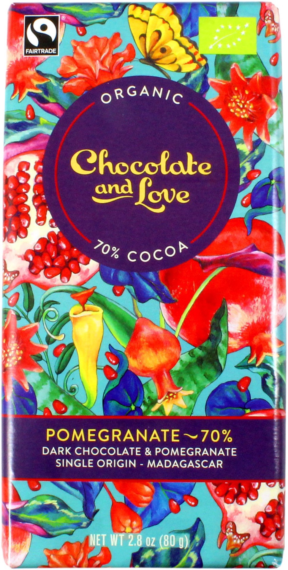 The cacao originates from Madagascar, valued worldwide for its unique flavour notes, with hints of citrus and natural sweetness. Pomegranate is tart and Madagascan cocoa beans are known for their natu…