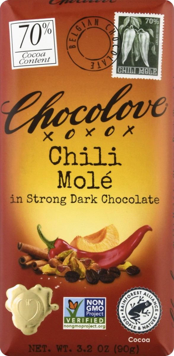 Chili Mole in strong dark chocolate Non GMO Project verified. nongmoproject.org. Holy mole! Cinnamon and chili spices are combined with strong dark chocolate and blended with crunchy pistachios, chewy…