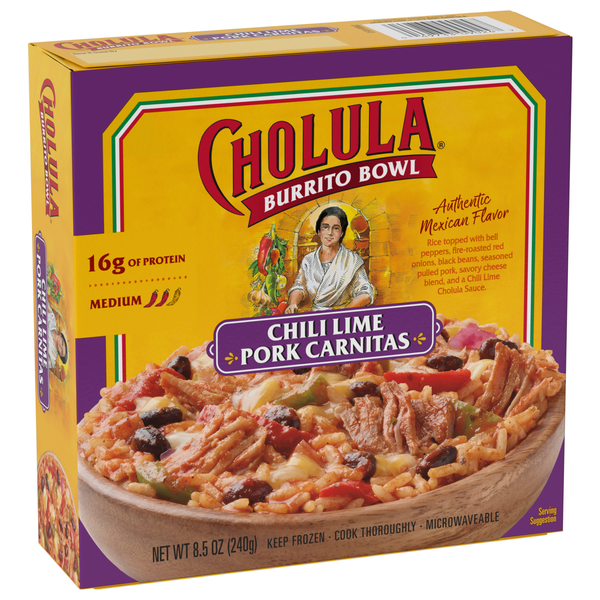 Looking for a satisfying dinner with authentic Mexican flavor that's ready in less than 5 minutes. Cholula Chili Lime Pork Carnitas Frozen Burrito Bowl delivers it all with 16 grams of protein and Cho…