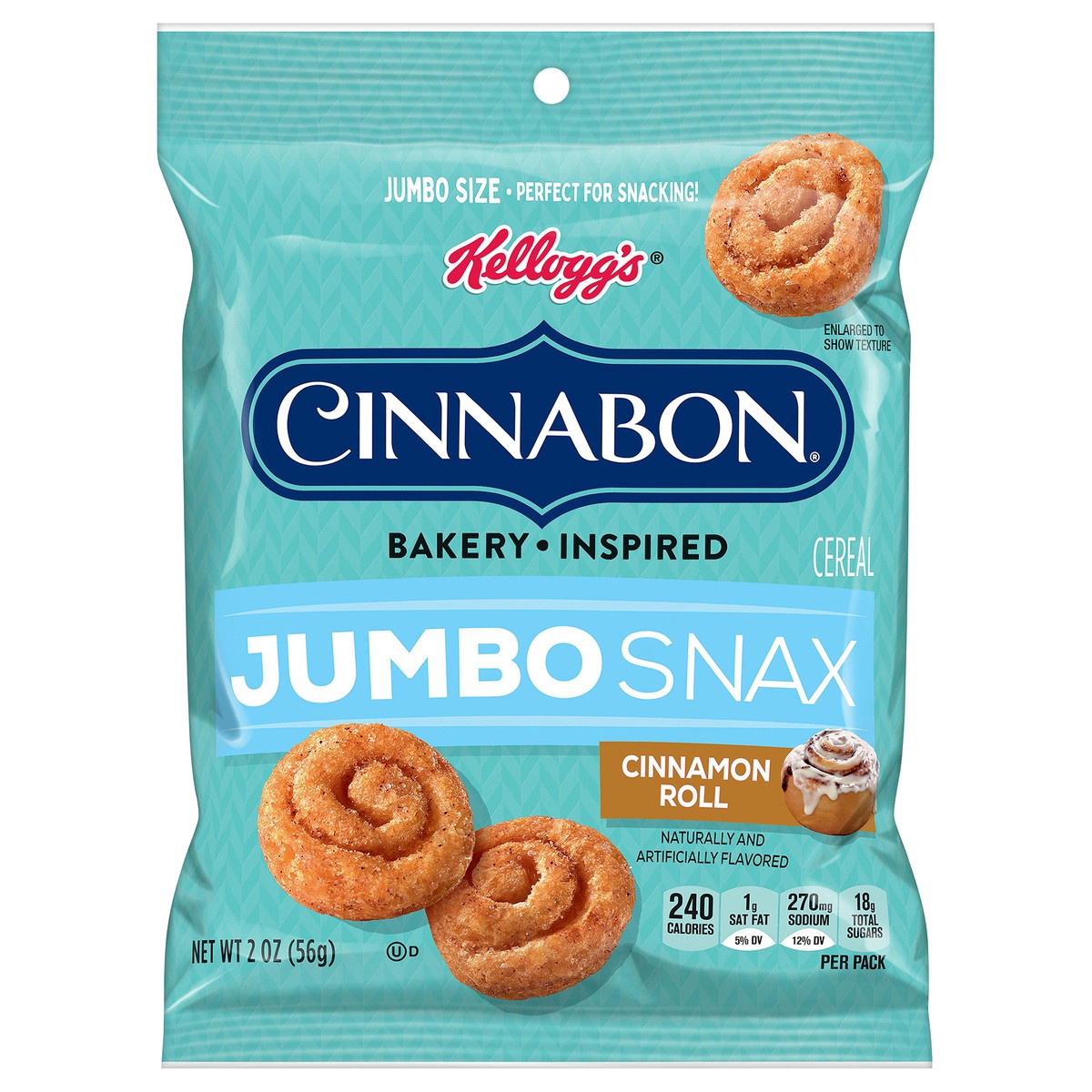 Jumbo-sized and packaged perfectly for snacking, Kellogg's Cinnabon Jumbo Snax are inspired by the signature, craveable taste of Cinnabon and come in fun, cinnamon roll shapes. This convenient multipa…