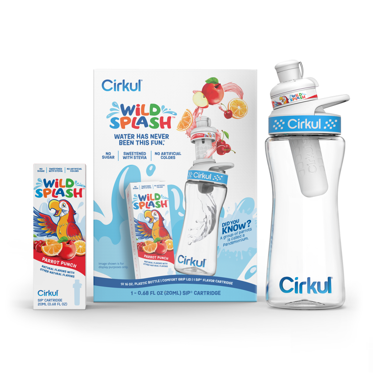 This Starter Kit is the perfect way for your kiddo to get started with Cirkul. Each box includes one 16oz Plastic Water Bottle, a Blue Comfort-Grip Lid, and a Wild Splash Parrot Punch flavor cartridge…