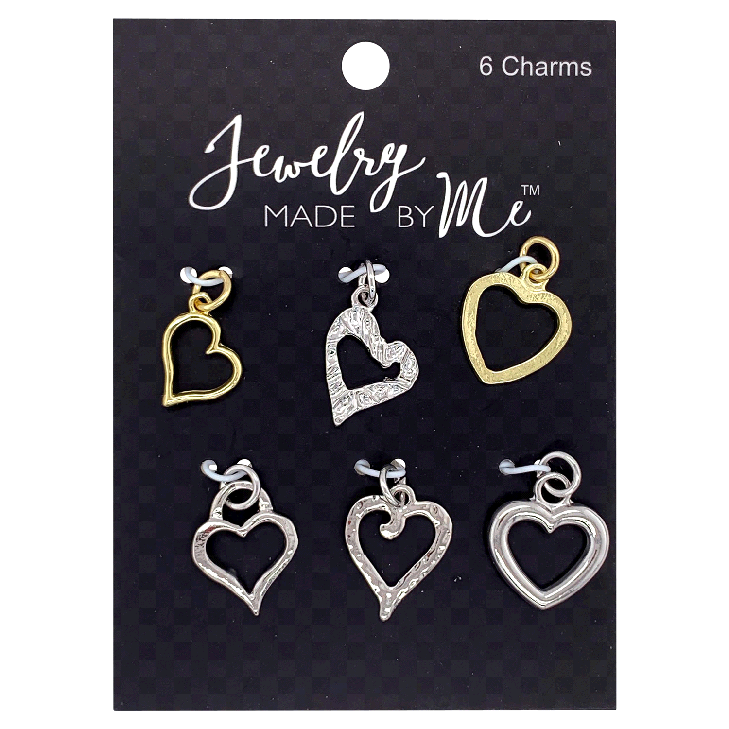 Use these classic heart charms in your next DIY jewelry project. There are six charms in all, two in gold and four in silver and all are cut out in the center. One is silver with a slight texture in t…