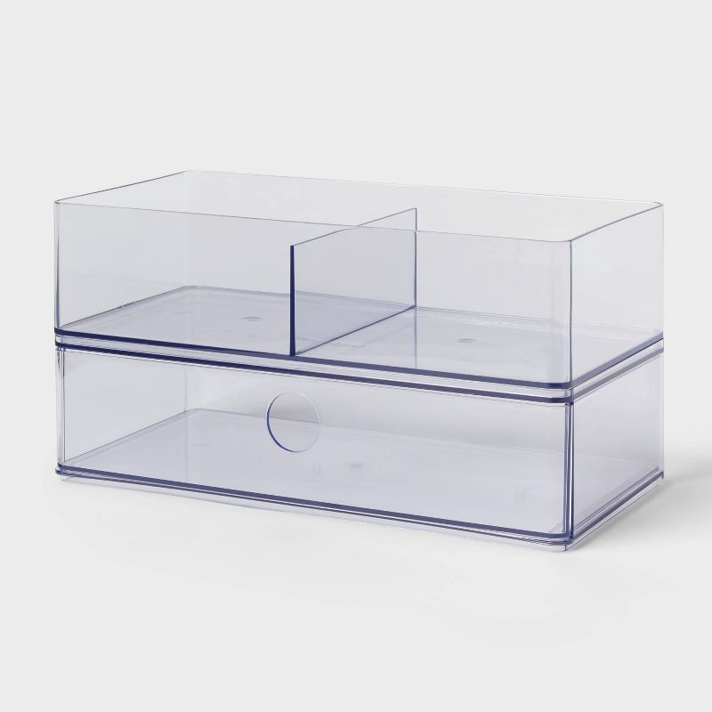 Transform your bathroom organization with this Clear Divided Bin with Drawer from Brightroom™. The plastic bin has a rectangular two-tier silhouette and boasts a transparent construction for better vi…