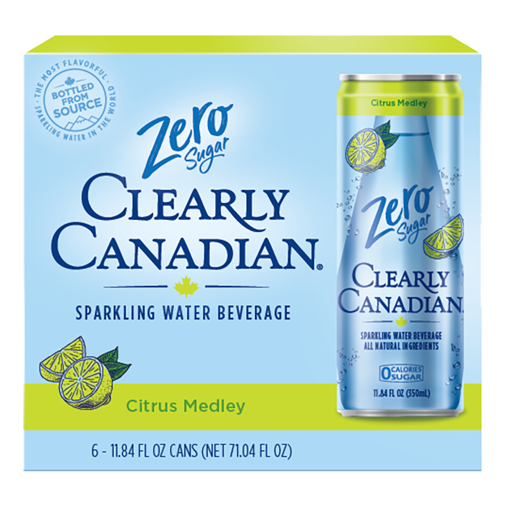 Clearly Canadian Sparkling, Zero Sugar Citrus Medley combines fresh lemon and lime with a touch of orange for a refreshing citrus taste