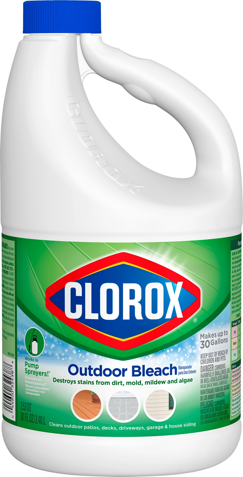 slide 5 of 5, Clorox Pro Results Outdoor Bleach, Destroys Stains From Dirt, Mold, Mildew and Algae, Clorox Bleach Liquid for Outdoor Use, Works in Pump Sprayers, 81 fl. oz. Bottle, 81 oz